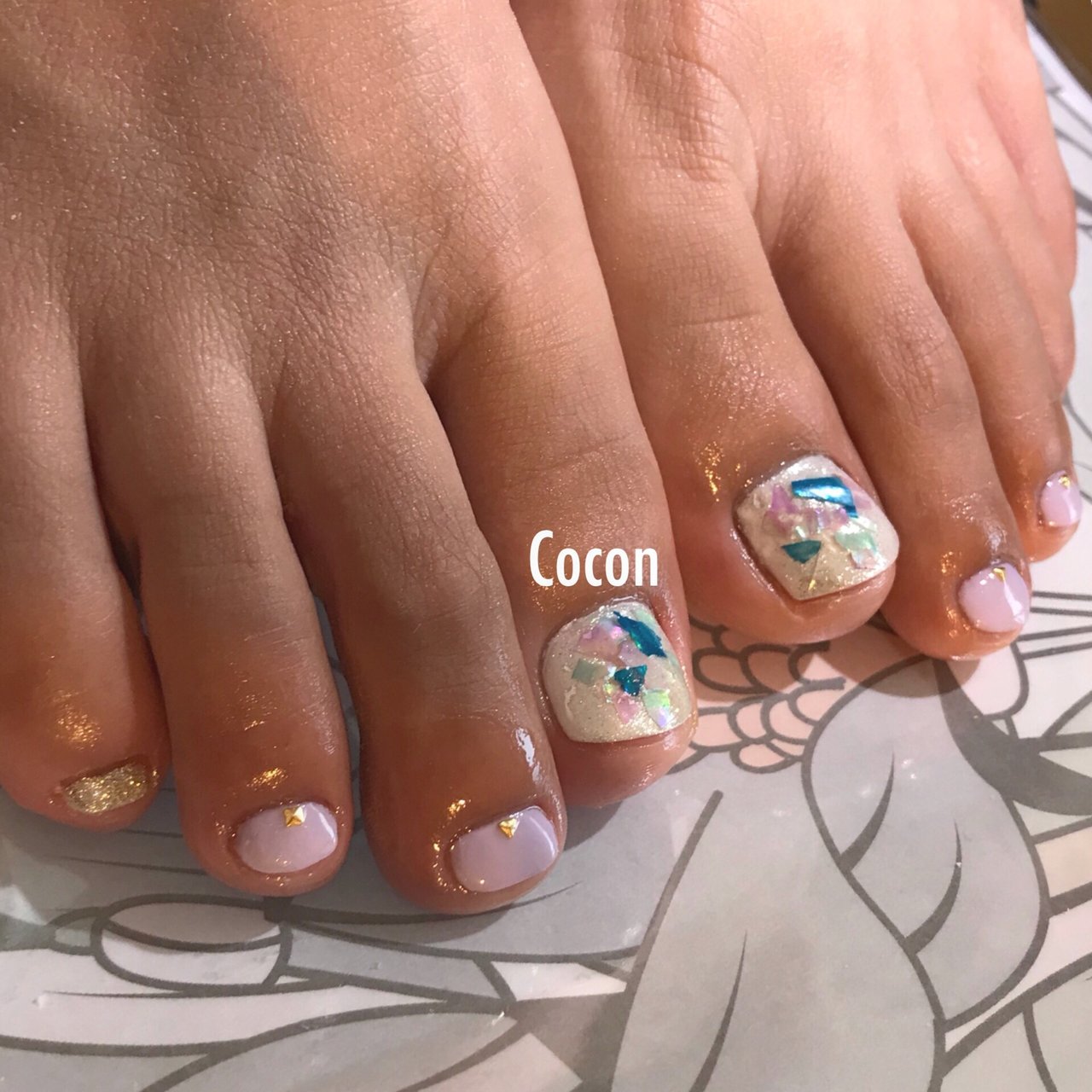 ピンク ラベンダーカラーのフットネイル オーロラフィルムイン ペディキュアネイルデザイン ネイルデザイン ネイル